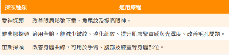 無雙電波另一項重要特色為多探頭的配置,陳南宏醫師認為這樣的設計讓療程更具彈性與精準,從而達到客製化的目標。他提到,不同部位與不同肌膚厚度所需的電波能量也不一樣。由於熱門電波的探頭是固定的,每次療程都只能選擇單一種探頭,例如施作眼周時,就無法再做臉部其他部位,限制了療程的靈活度。無雙電波擁有愛神、雅典娜及宙斯等三種探頭,醫師可在療程中依據需求更換不同探頭,讓治療更貼近個人狀況。例如,可先使用「雅典娜探頭」來改善抬頭紋,之後再更換「愛神探頭」處理眼周細紋,一次療程即可達到更全面的效果。
