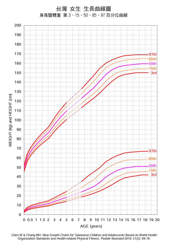 (Walter Chen, Mei-Hwei Chang New Growth Charts for Taiwanese Children and Adolescents Based on World Health Organization Standards and Health-related Physical Fitness Pediatr Neonatol 2010;51(2):69−79)