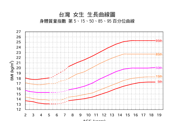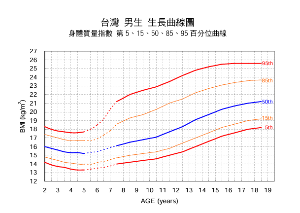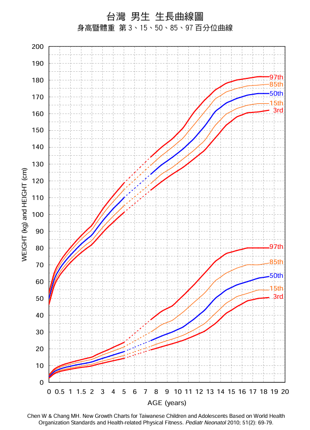 依據中國醫藥大學附設醫院陳偉德醫師和台大醫院張美惠醫師2010年發表於2010年發表之研究結果繪製,適用於台灣0至18.5歲兒童與青少年