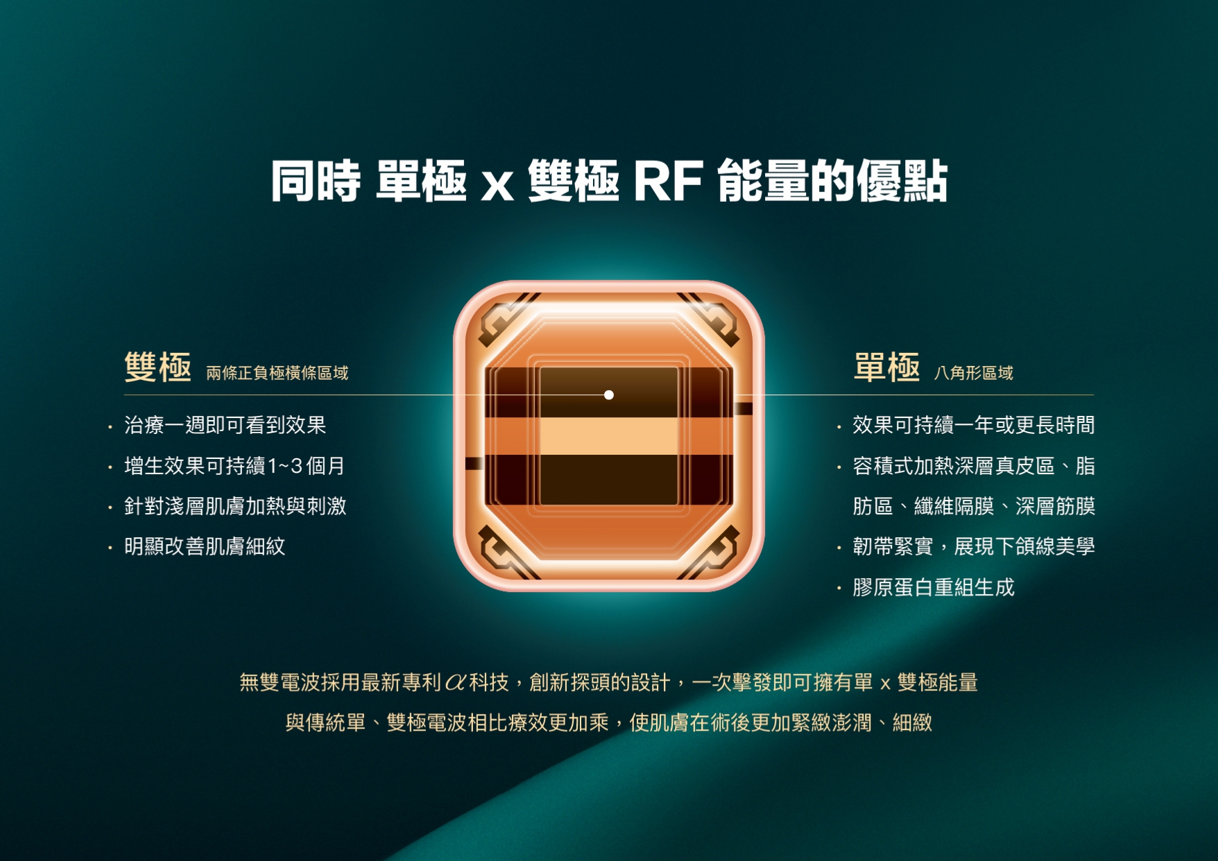 無雙電波採用最新專利 α 科技,透過單極和雙極電流同時作用,加熱皮膚的深層和淺層。利用精準的絕對容積式加熱原理,刺激真皮層生成更多膠原蛋白和