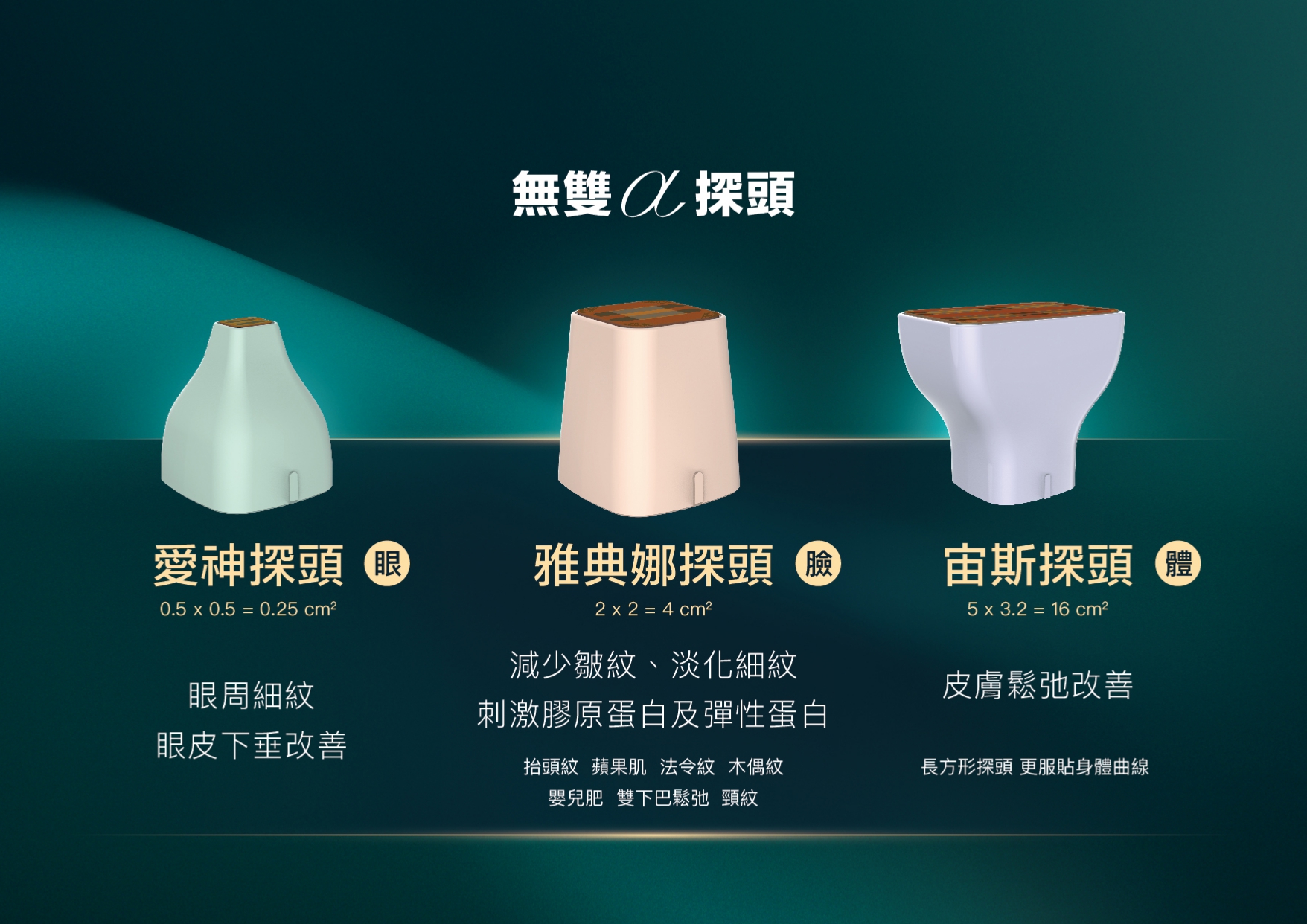 雅典娜探頭 (Athena):全臉專用1000發。針對輪廓線、雙下巴、法令紋強力拉提。愛神探頭 (Eros):眼周專用600發。細緻呵護眼部薄弱肌膚,改善眼皮下垂與細紋。