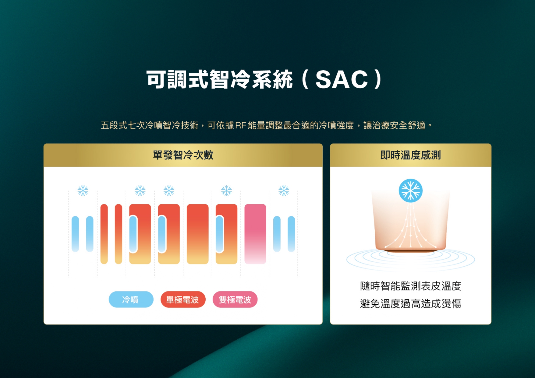 αLPHA™ 交替脈衝專利: 一發中包含 4 個單極脈衝(深入 4.3mm)與 1 個雙極脈衝(作用於 1mm),同步激活真皮深淺層的膠原蛋白,研究證實膠原蛋白新生率最高可達 239%。SAC 智冷系統: 七段式冷卻脈衝(5段強度調節),在加熱能量輸出的同時精準降溫,大幅降低痛感,實現免敷麻的高舒適體驗。