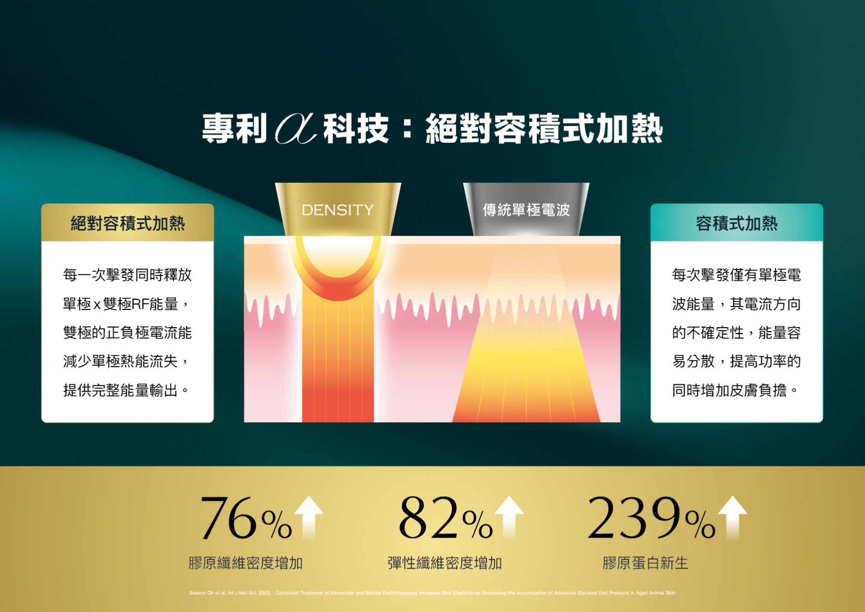 「單極 × 雙極」雙效抗老,定義緊緻新高度無雙電波(Density RF)採用韓國原廠研發的專利 αLPHA™ 技術,是目前市面上少見能在「單次擊發」中同時釋放單極與雙極電波的頂級機種。不僅具備傳統單極電波的深層拉提實力,更結合雙極電波優化表皮膚質,達成「深層支撐、淺層緊緻」的全方位效果。